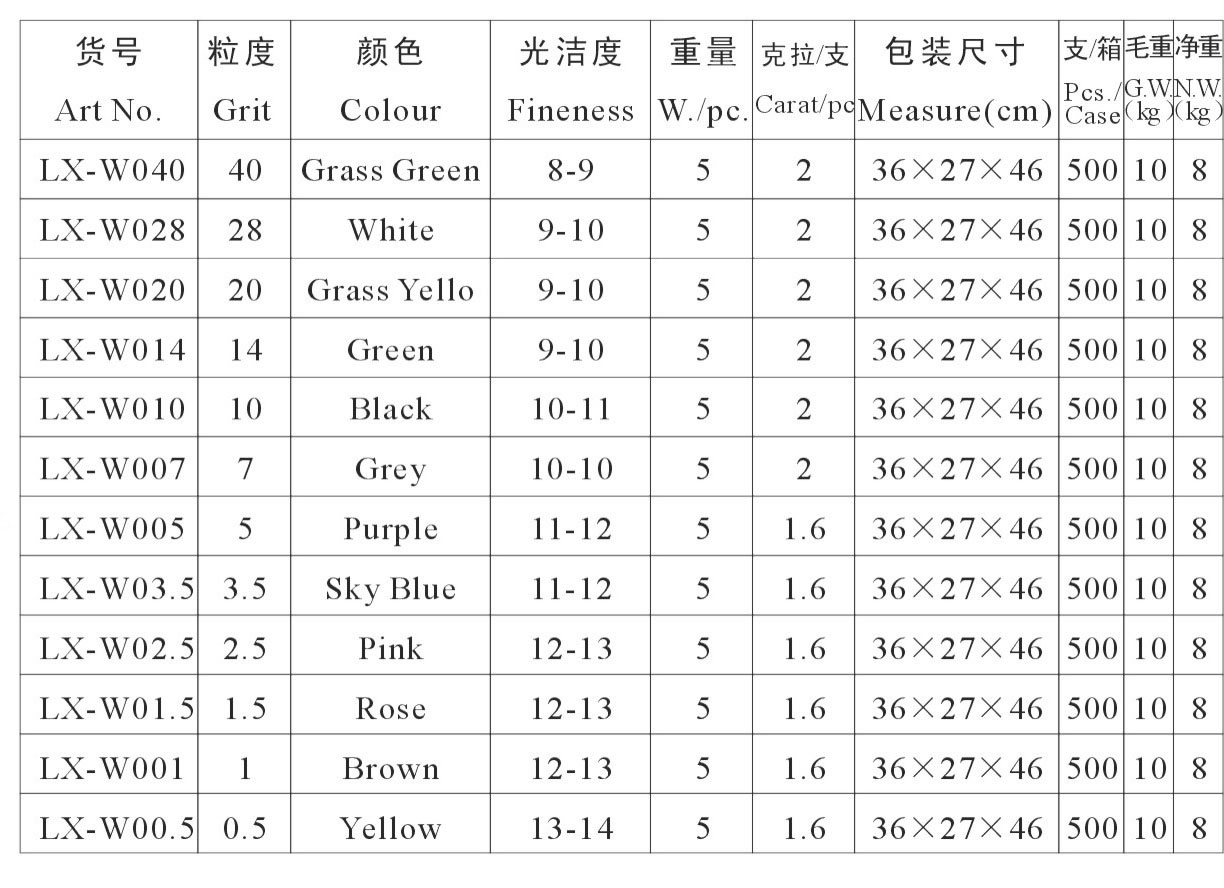 | Size: | Art. No. Grit Color Crt/Pc Finish LX-W040 40 Grass Green 2 8-9 LX-W028 28 White 2 9-10 LX-W020 20 Grass Yellow 2 9-10 LX-W014 14 Green 2 9-10 LX-W010 10 Black 2 10-11 LX-W007 7 Grey 2 10-11 LX-W005 5 Purple 1.6 11-12 LX-W03.5 3.5 Sky Blue 1.6 11-12 LX-W02.5 2.5 Pink 1.6 12-13 LX-W01.5 1.5 Rose 1.6 12-13 LX-W001 1 Brown 1.6 12-13 LX-W00.5 0.5 Yellow 1.6 13-14 |